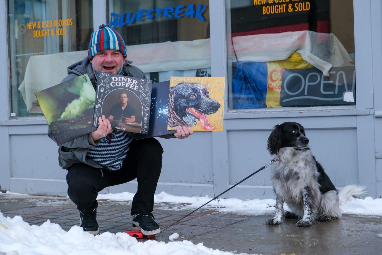 Peterborough musician Charlie Glasspool with four recent local records — and his dog Myrtle. (Photo: Will Pearson)