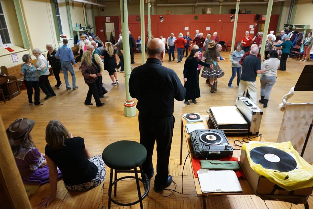 Now in his 80s, Whatman started leading square dance parties in Fenelon Falls in 1990, and soon broadened his reach to Lindsay, Peterborough, and beyond. Wherever he traveled for dances he brought with him a big suitcase of vinyl records, a practice he keeps up to this day.