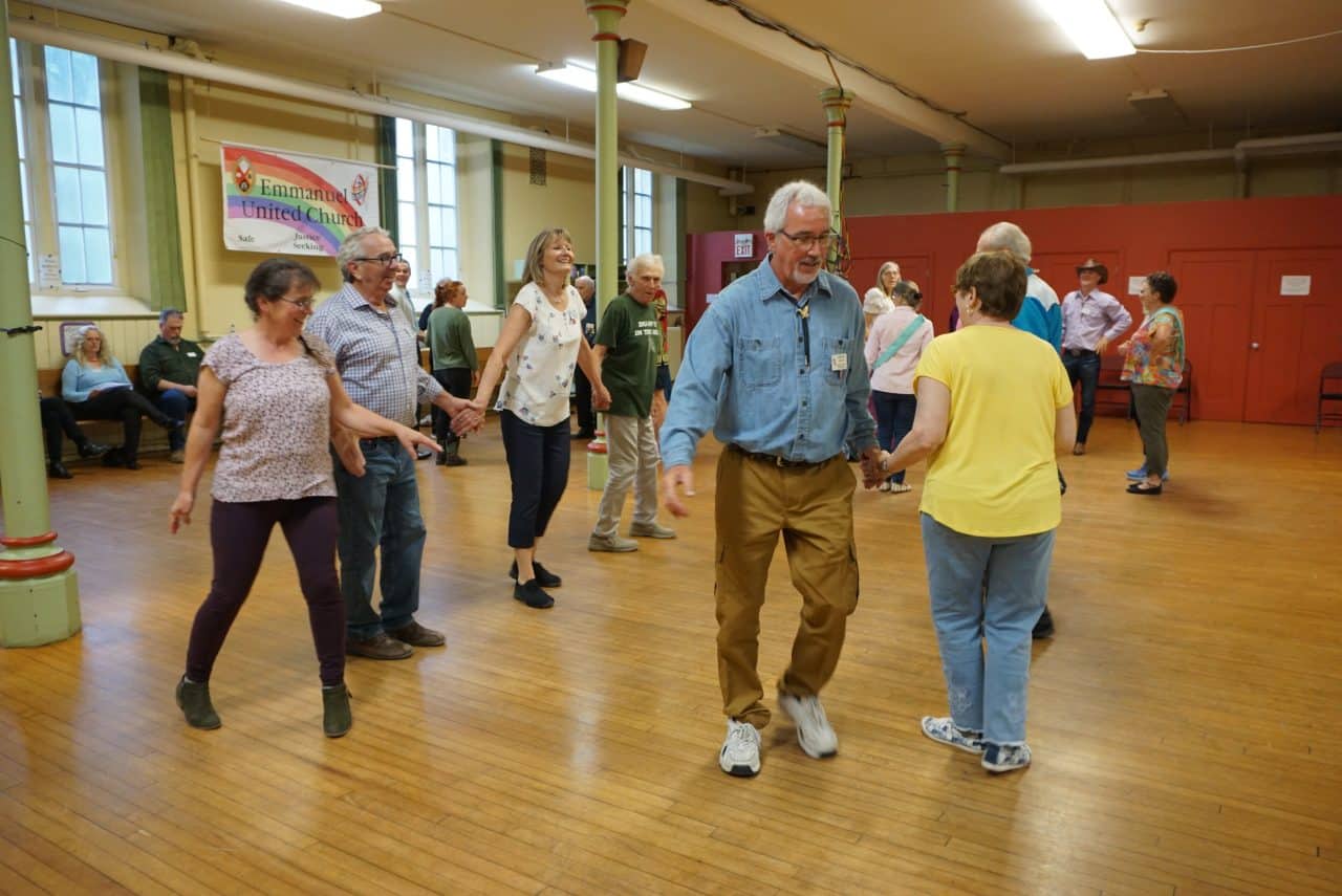 On Monday nights, the basement of Emmanuel United Church is filled with music and laughter. Dancers of all ages join hands and spin circles, step together across the floor, or curtsy to their partners as they meet in the middle. Participants cry out in excitement as they surge forward or step back, and everyone listens carefully for the caller’s instructions.