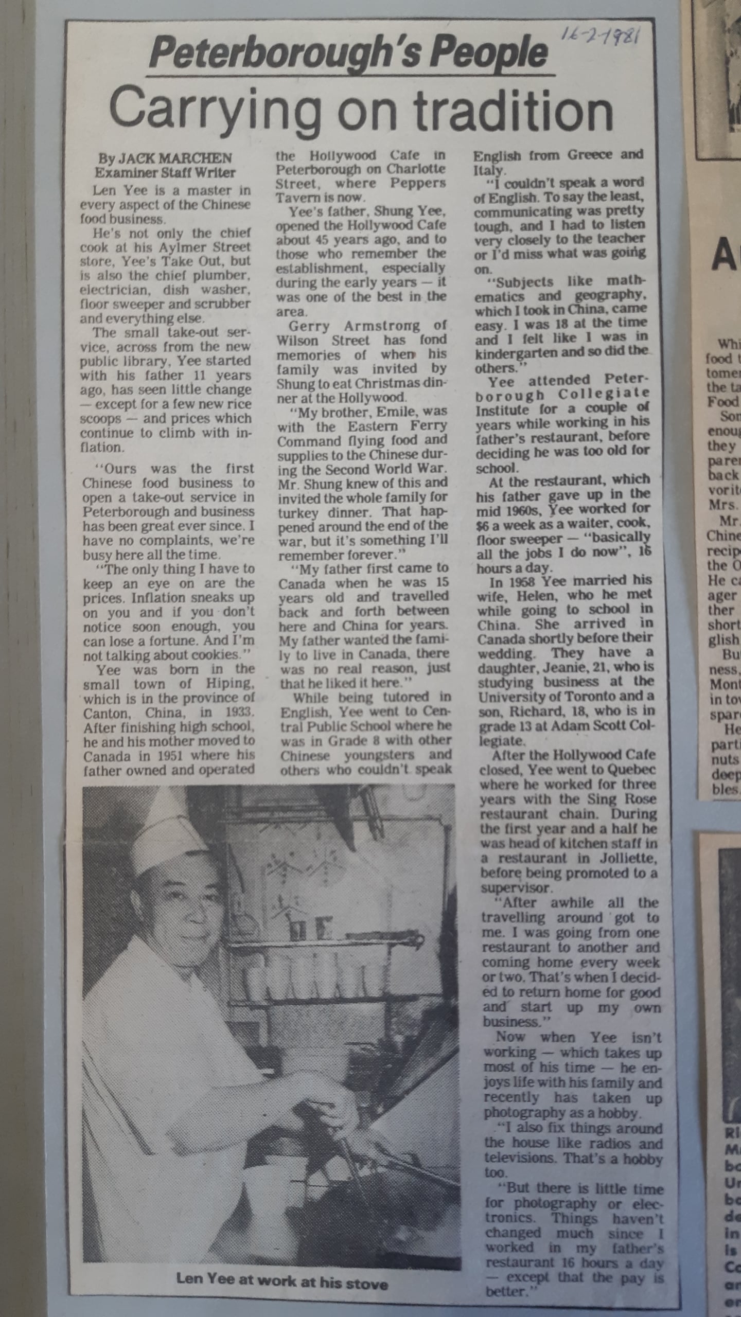 According to reporting in the Peterborough Examiner, Shung Yee immigrated to Canada and opened the Hollywood Cafe on Charlotte Street in the 1930s. In 1951, Shung Yee’s teenage son Len Yee moved to Canada and began working in the restaurant, eventually becoming its manager. But the Hollywood Cafe closed in the mid-60s, and Len Yee moved to Quebec for a few years. He returned to Peterborough and opened Yee’s Chinese Food, a take-out spot, with his wife Helen in 1970. “Ours was the first Chinese food business to open a take-out service in Peterborough,” Len Yee told the Examiner.