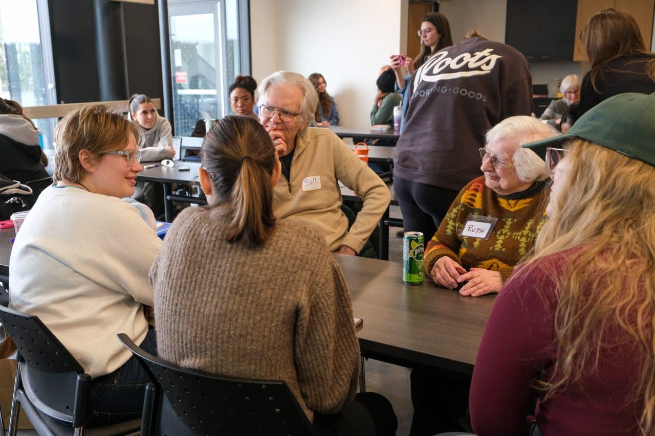 So for this year’s class, Russell invited older adults to join the course as volunteers. Dozens of people aged 65 and up expressed interest, and 13 were selected. They don’t pay tuition, write exams, or get academic credit. But they attend lectures, ask questions, share their experiences and get to know the students in the class.