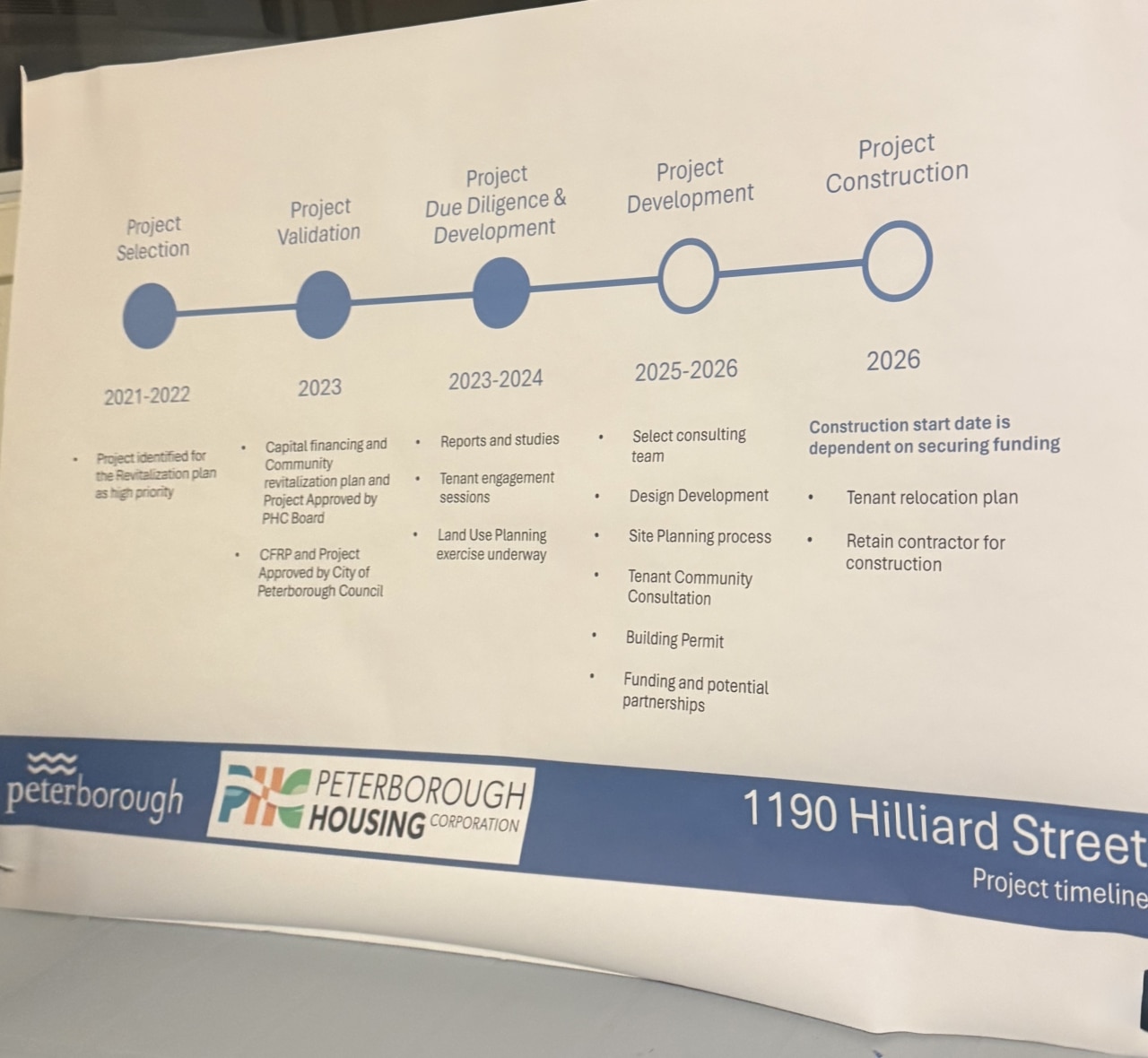 A sign board presented at the January 22 meeting showing PHC’s proposed timeline, photographed by one of the meeting attendees. Residents say there were no printed materials for them to take home from the meeting. (Source: Hilliard St resident)