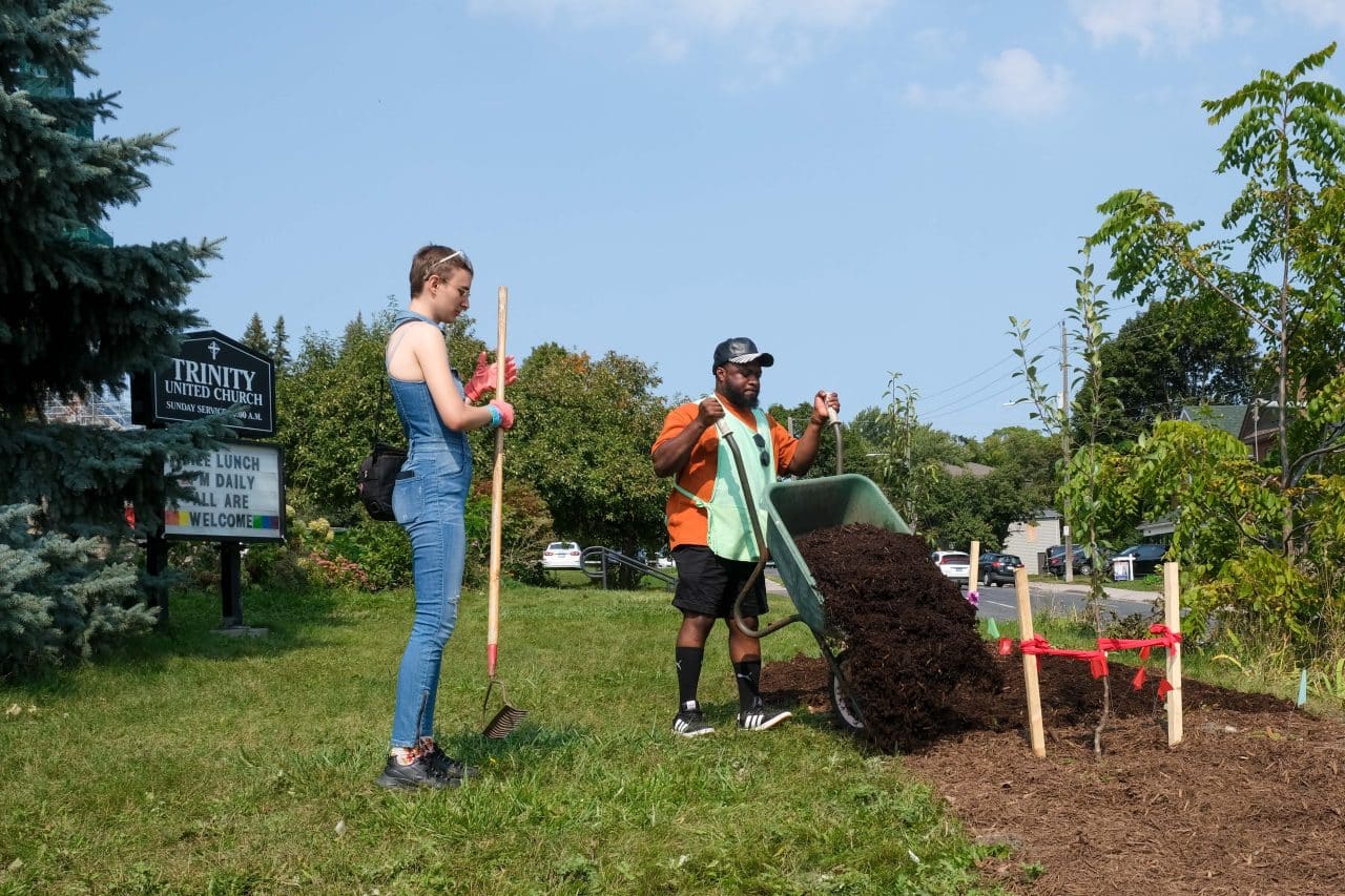 Volunteers and guests of the Trinity Community Centre established a community orchard, planted a row of shade trees, and installed rain garden planter boxes on the grounds of the Trinity Centre this week. The idea was to “help address some challenges like storm water management, lack of shade, food security and community belonging,” according to a media release.
